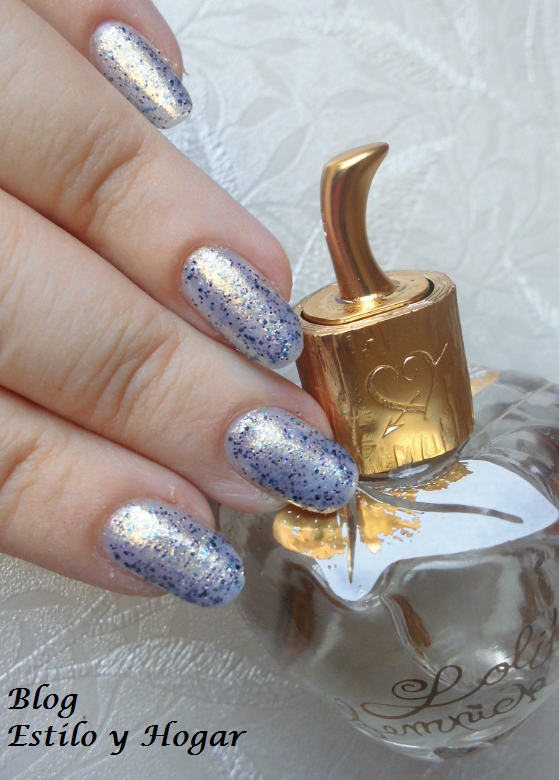 Celestial, con una base blanquecina y brillos de estrellas azules. Aunque en pleno sol le arrancaréis preciosos reflejos dorados.