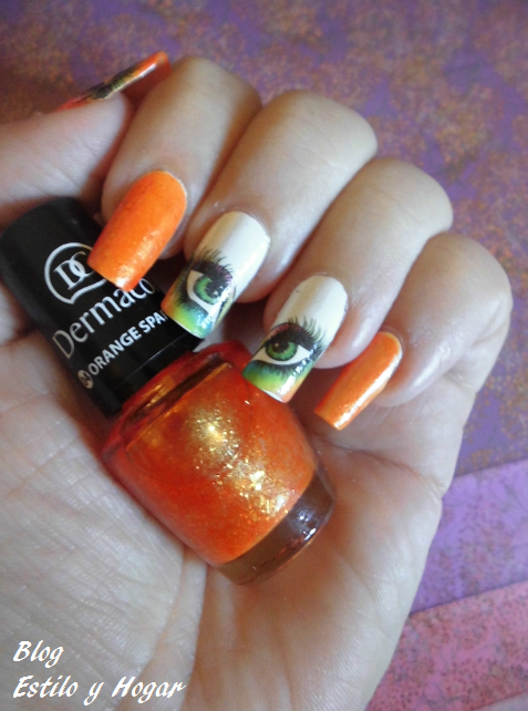 Este esmalte brillo de Dermacol es un tanto translúcido, para que se viera bien su tono y brillo utilicé esmalte color blanco de base, dejando dos uñas en color blanco para después decorarlas.